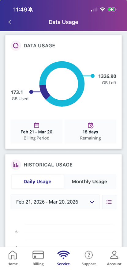 The Data Usage page provides detailed information about your internet data usage during the current billing period.