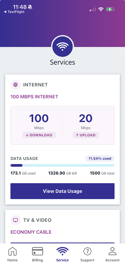 On the Services Page, your Internet service card shows a preview of your current data usage.